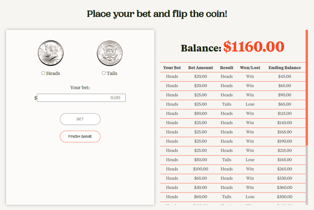 Puedes jugar el juego aquí (con un límite de tiempo reducido de 10 minutos y 25$ en total): https://elmwealth.com/coin-flip/