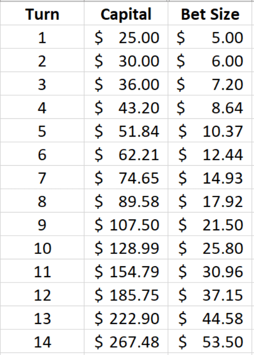 De esta manera, apostamos consistentemente el 20% de nuestro capital y podemos aumentar o reducir el monto absoluto de nuestra apuesta en función de nuestra tasa de éxito en el juego.
