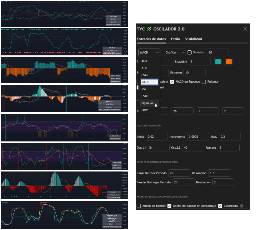 Adicionalmente hemos incorporado un nuevo indicador de Osciladores 2.0 donde podrán tener en un sólo indicador herramientas como el ADX, ATR, PARABOLIC SAR, MACD, RSI, ESTOCASTICOS, SQUEZE MOMENTUM Y ANCHO DE BANDAS DE BOLLINGER que iremos explicando su funcionamiento y cómo desarrollar estrategias de cada uno en nuestro curso de Indicadores y Estrategias del Canal. Recuerda seguir este curso en la lista de reproducción
